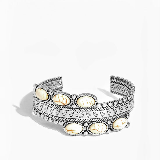 Discover the beauty of simplicity with the A League of Their STONE - White Female Bracelet. This artisanal silver cuff features studded borders, textured details, and stamped designs for a unique and sophisticated look. The haphazardly coalescing white stones add an earthy touch, while the natural variations in color make each piece one-of-a-kind. Sold individually.