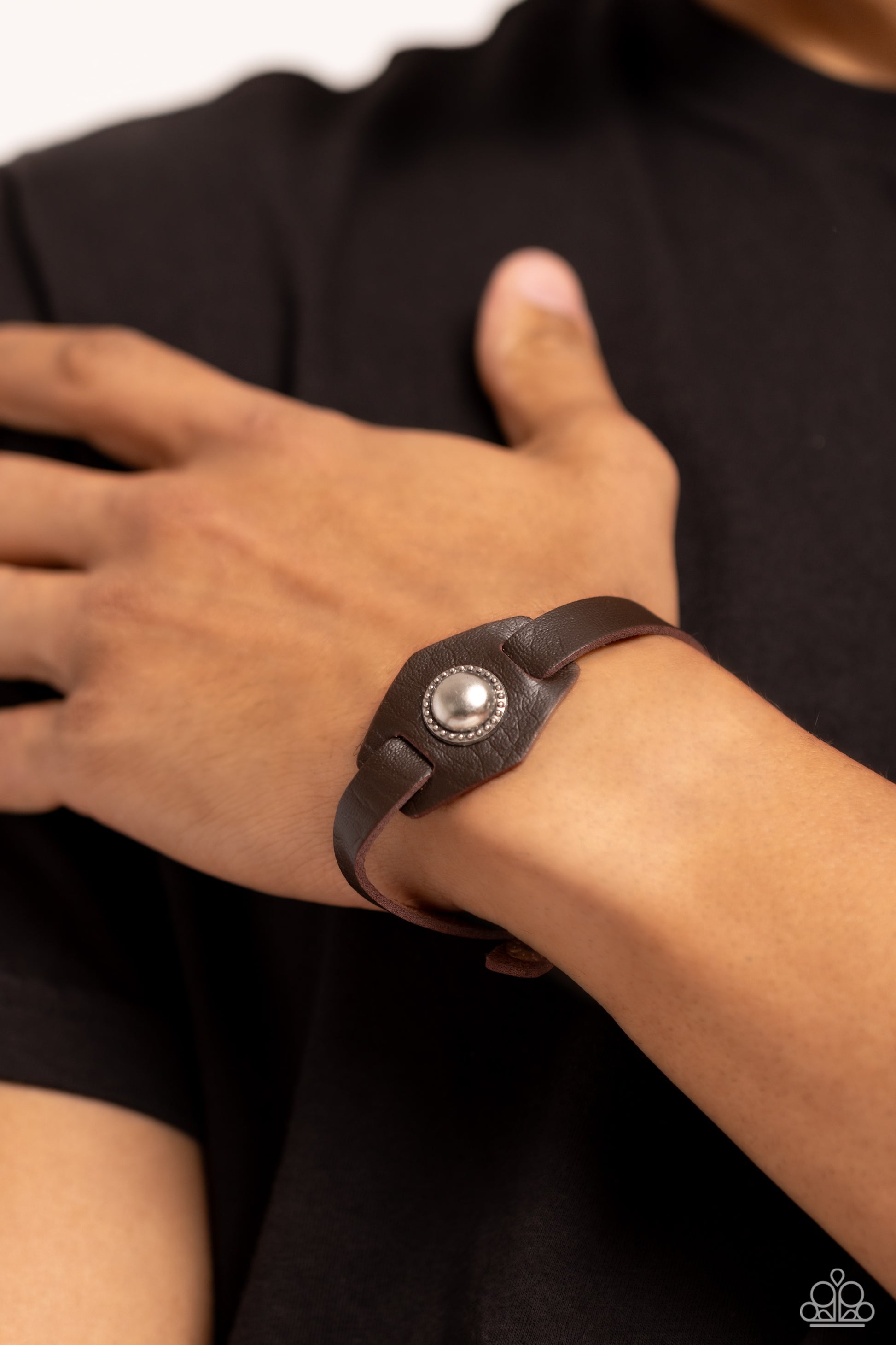 Bordered in a studded silver ring, an oversized silver bead adorns the center of a triangular leather frame that is threaded along a brown leather band for a rustic look. Features an adjustable snap closure.