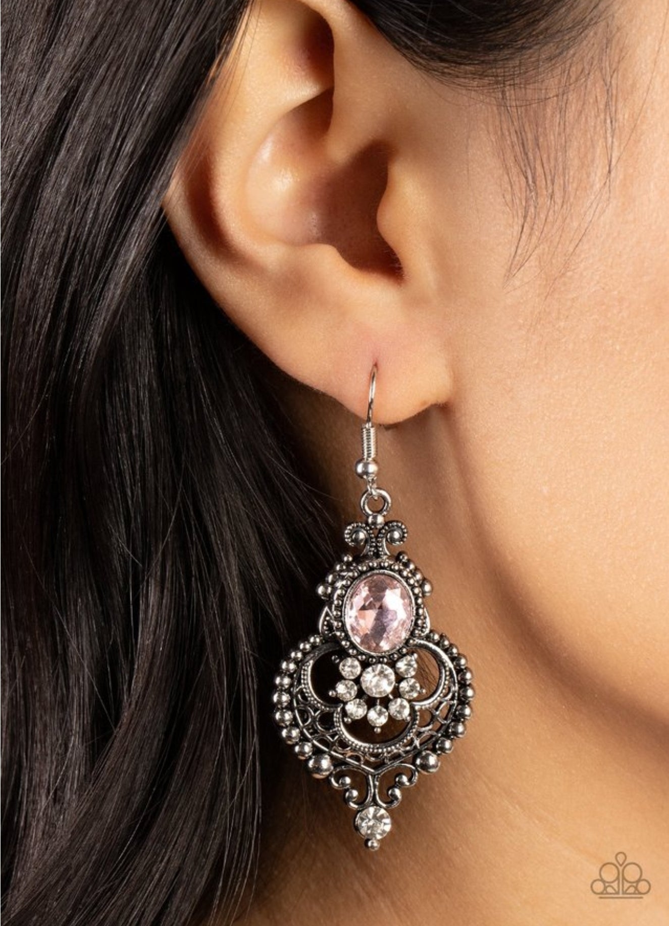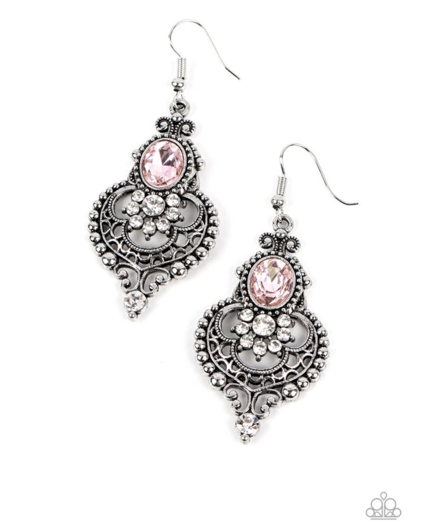 A white rhinestone floral accent flares out from the bottom of an oversized Gossamer Pink oval gem atop a studded backdrop of silver filigree, resulting in a regal lure. Earring attaches to a standard fishhook fitting.