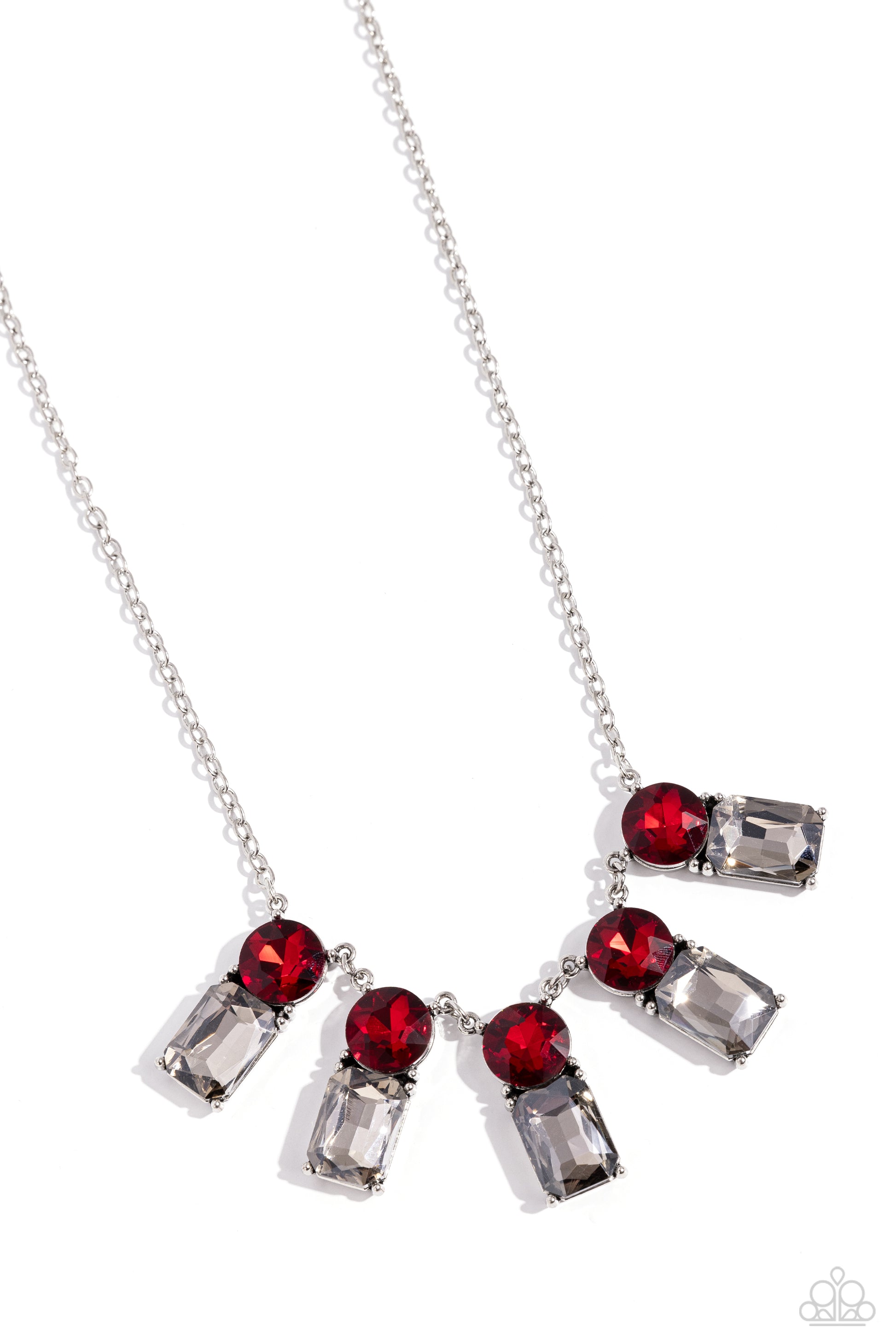 A sparkly row of oversized red gems regally sit atop emerald cut smoky rhinestone bases as they delicately link along a dainty silver chain below the collar, resulting in a royal glamorous centerpiece. Features an adjustable clasp closure.
