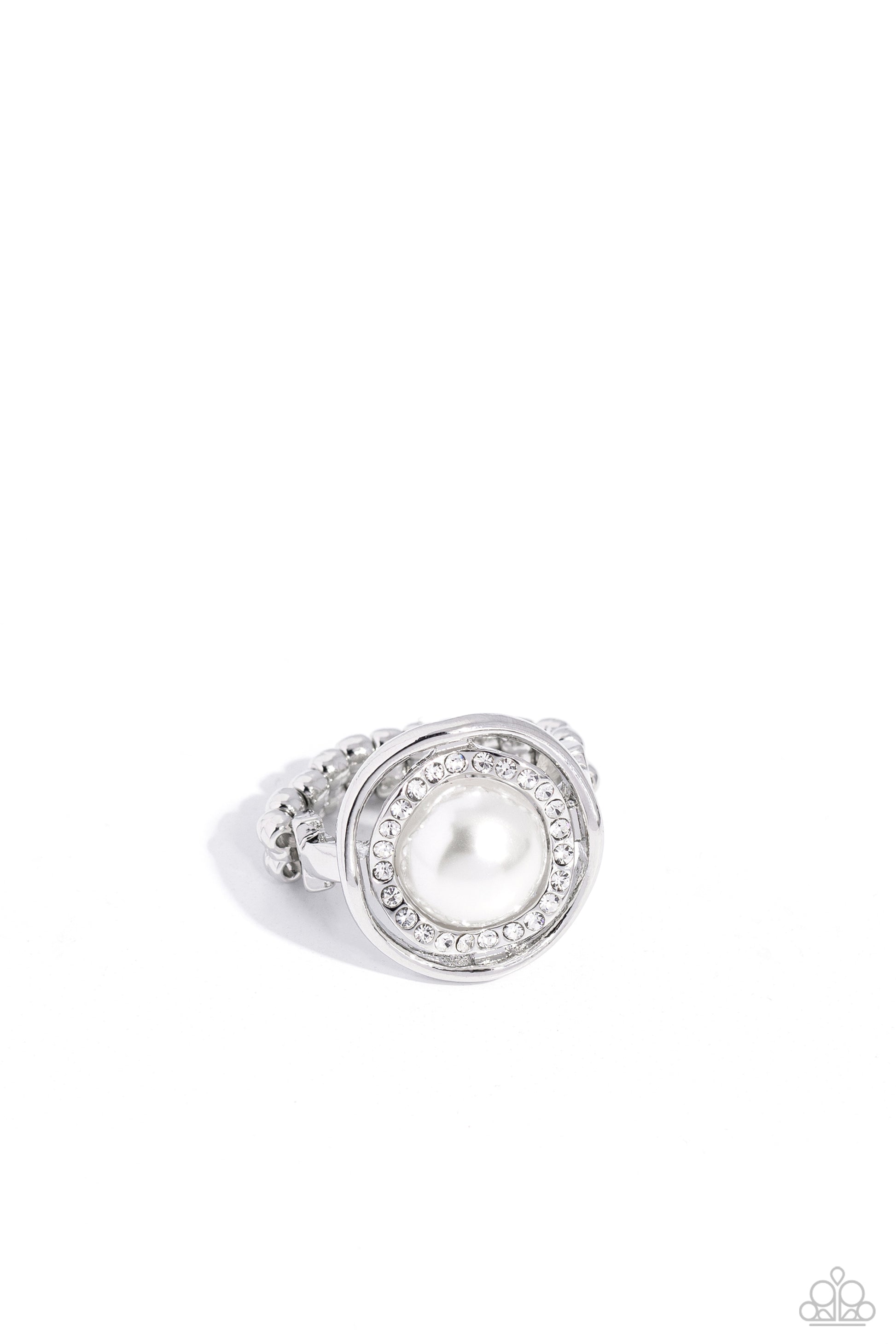 A slightly warped silver hoop encircles a glossy white pearl atop a dainty silver band. A daintier warped silver hoop, encrusted with white rhinestones, curls around the pearl inside the larger silver hoop for a touch of glitz to the sophisticated centerpiece. Features a dainty stretchy band for a flexible fit.