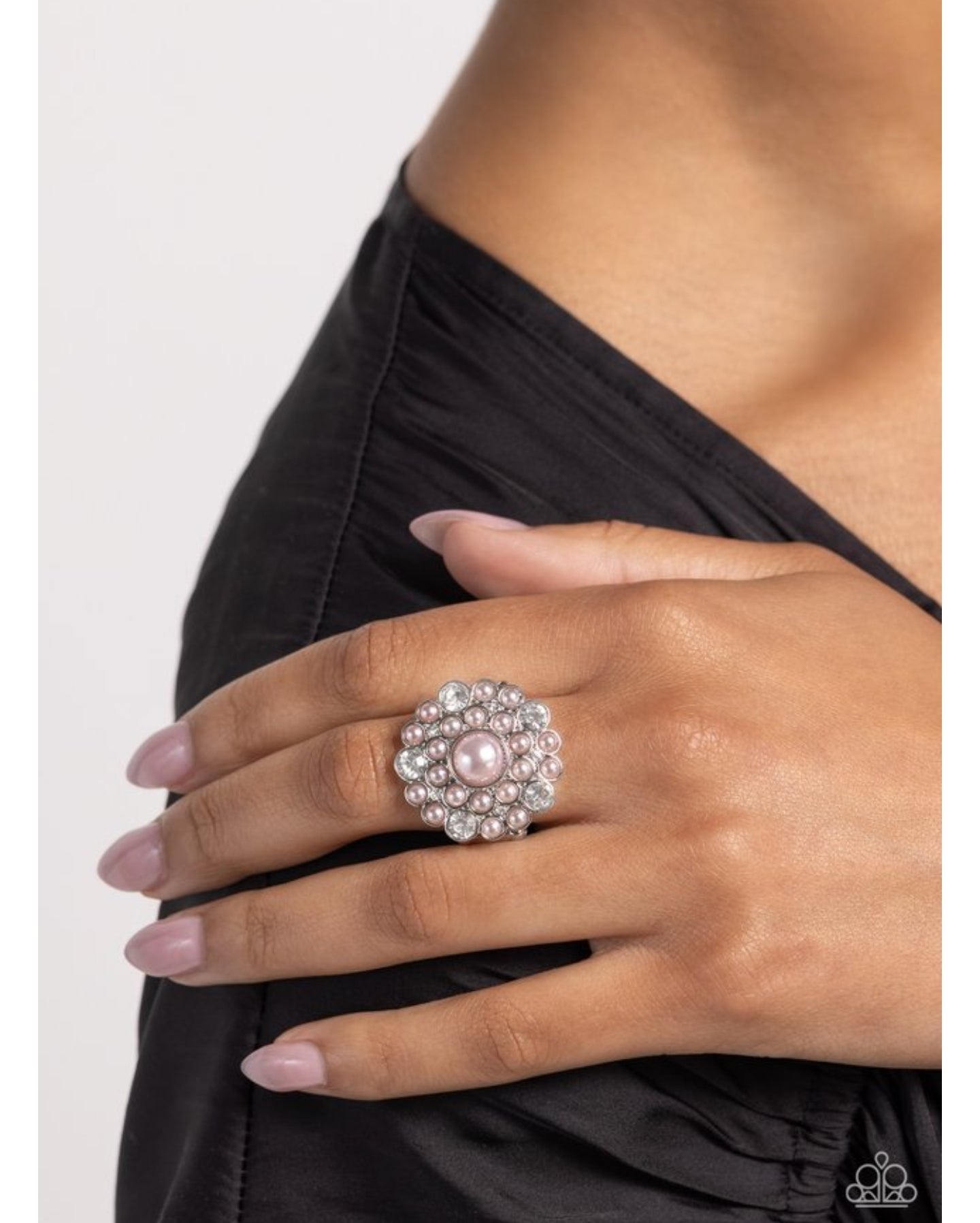 An explosion of white gems and dainty glossy baby pink pearls encircle a larger baby pink pearl center, creating a glamorous silver centerpiece atop the finger. Features a stretchy band for a flexible fit.