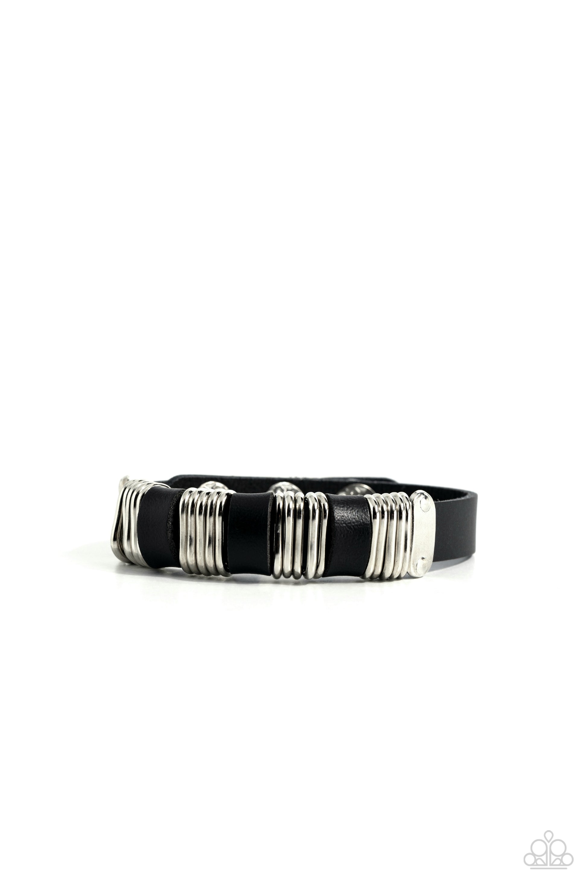 Black leather loops alternate with sections of oval silver rings between two studded silver plates, creating an edgy accent at the center of a slim black leather band. Features an adjustable snap closure.
