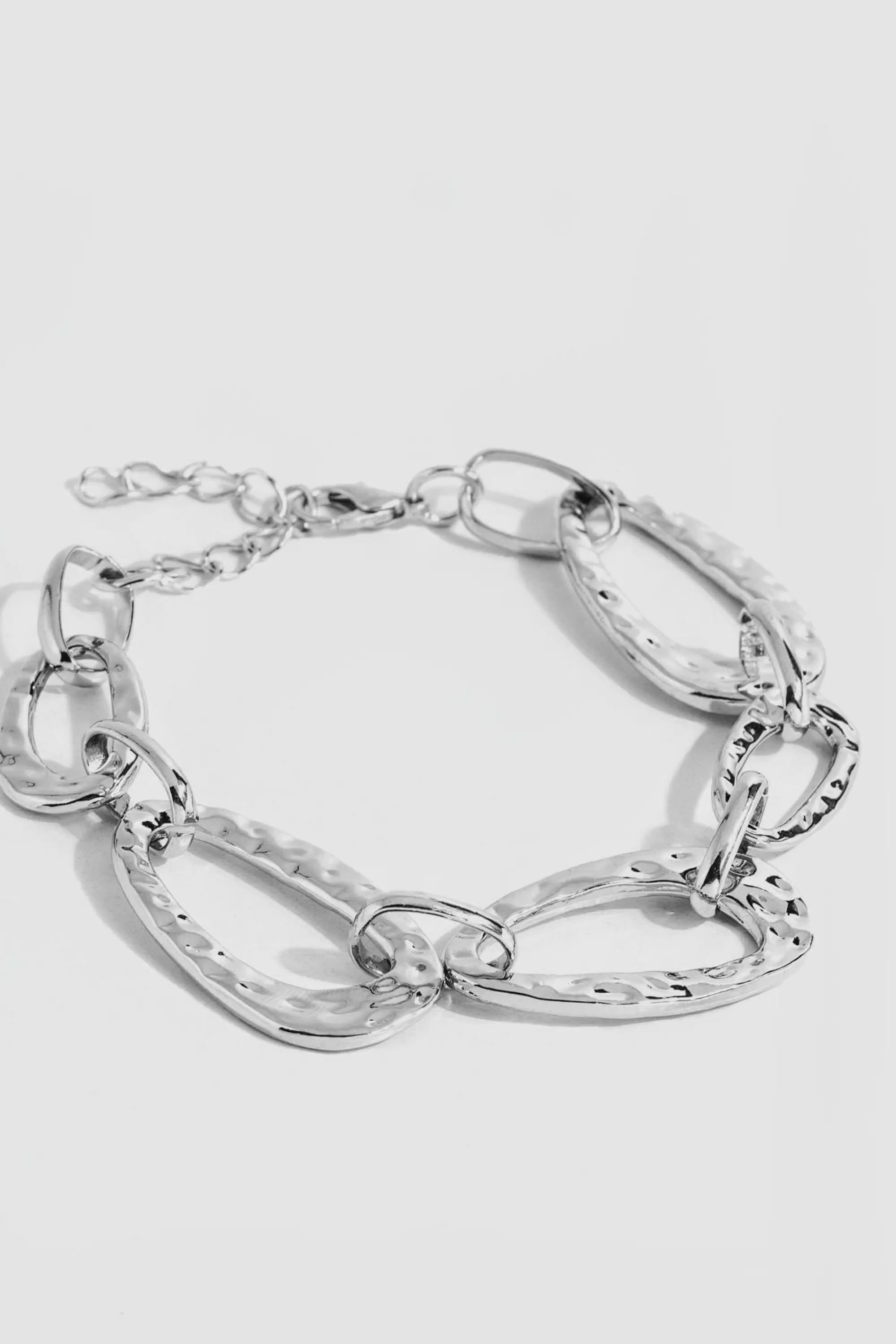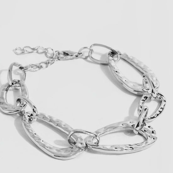 A hammered collection of asymmetrical silver ovals delicately links with silver fittings around the wrist, resulting in a monochromatic statement piece. Features an adjustable clasp closure.