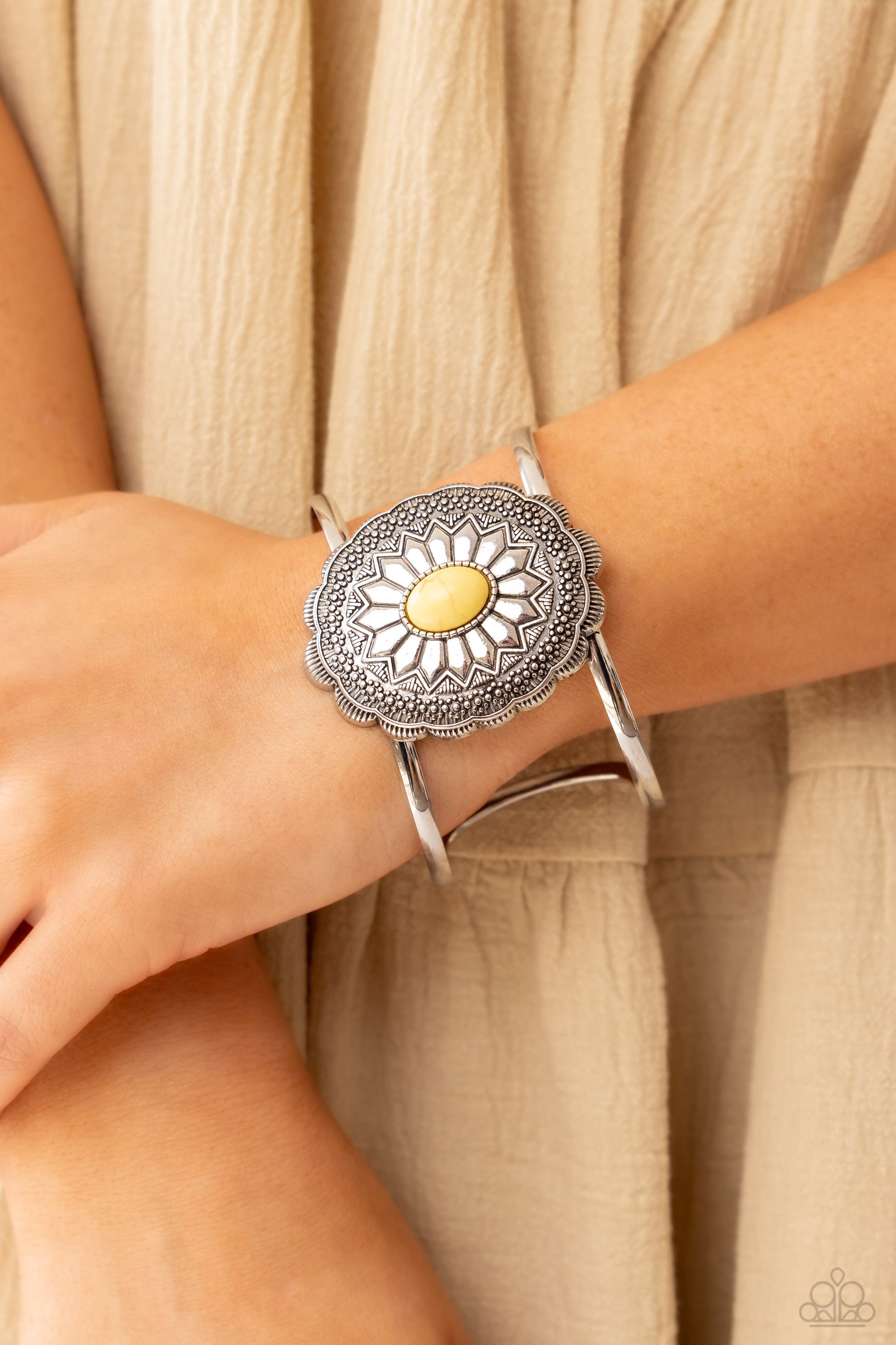 An oval yellow stone is pressed into the floral embossed center of a studded and scalloped silver frame atop a layered silver cuff, creating an authentic floral centerpiece atop the wrist.
