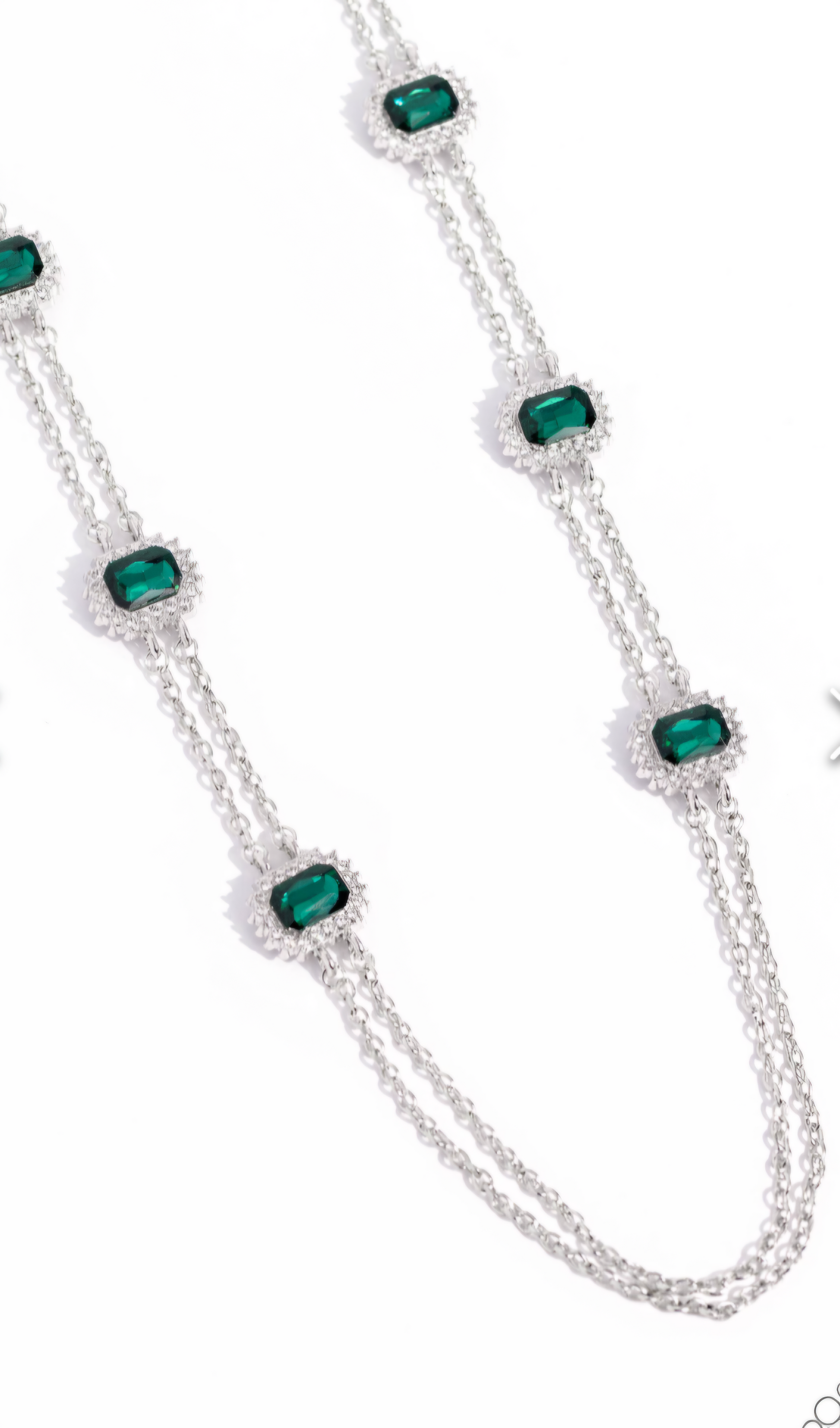 Pressed in sunburst-like, rhinestone-encrusted pronged silver fittings, a collection of emerald-cut green gems are infused between a double-strand of silver chains for a standout statement. Features an adjustable clasp closure.