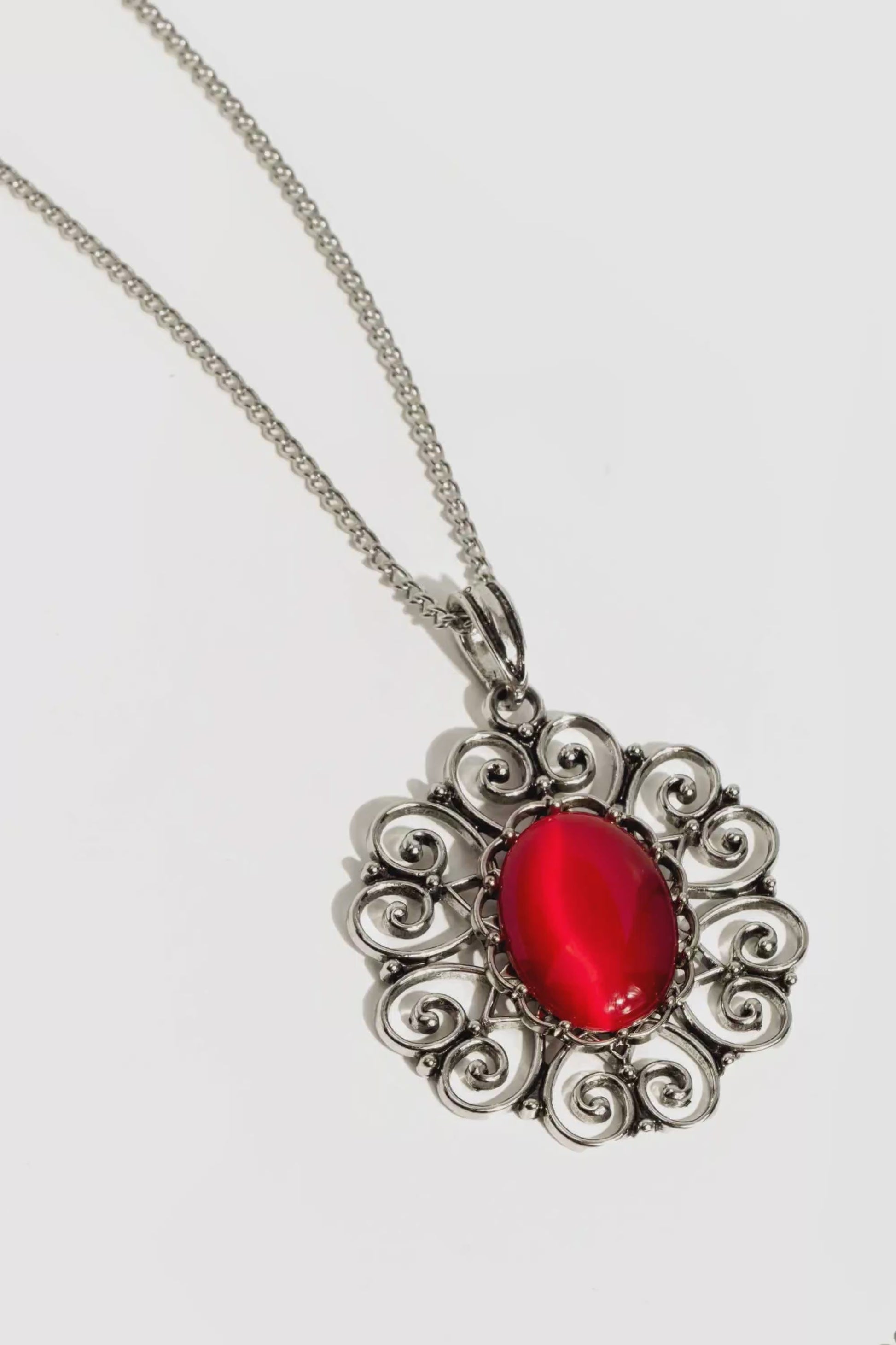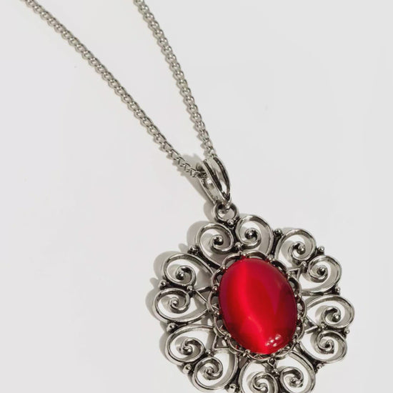 Swirls of silver curl into frilly hearts as they frame a red cat's eye stone, forming an oversized pendant that swings from an elongated silver chain. Features an adjustable clasp closure.