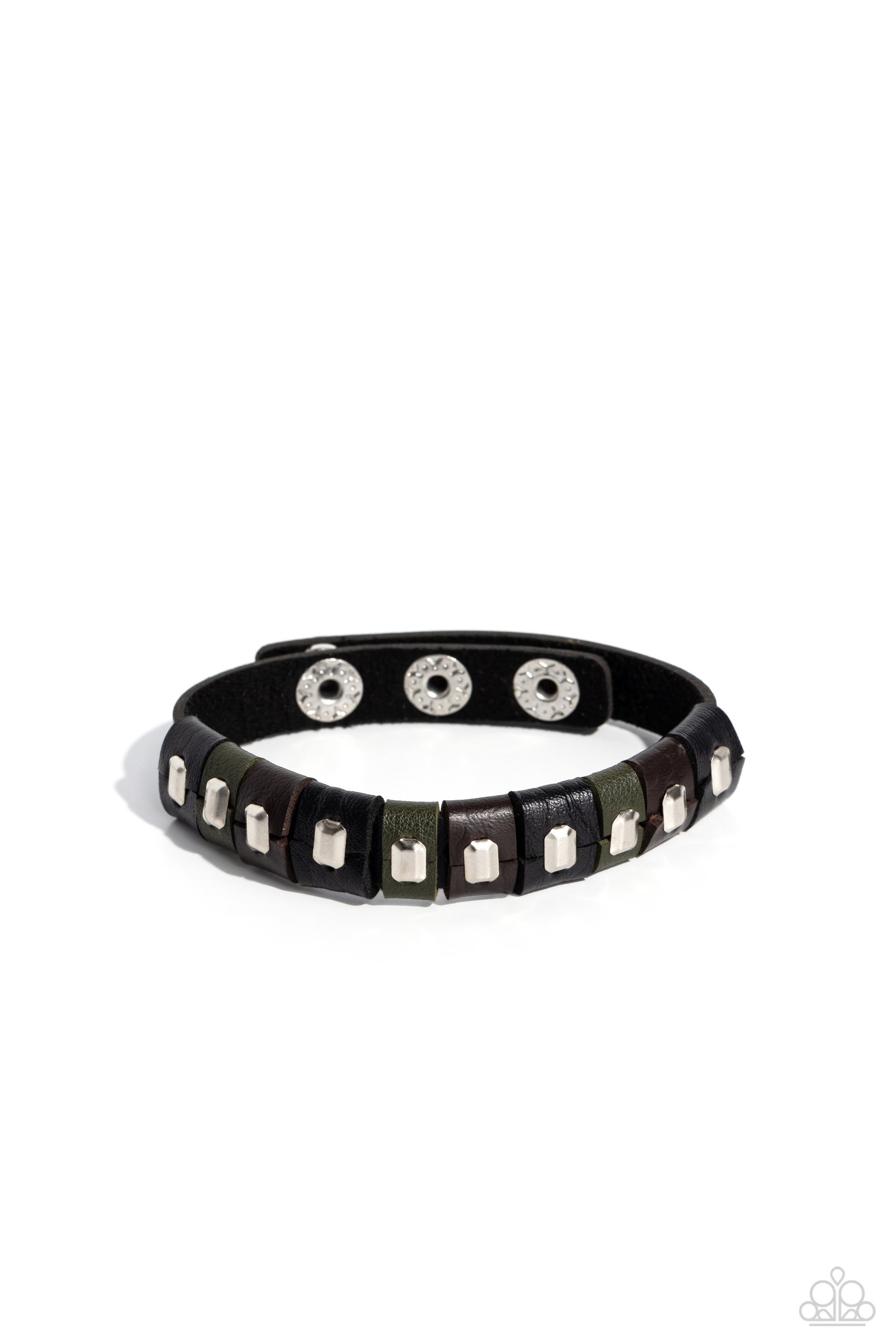 Sections of green, brown, and black leather wrap around an urban black leather band. Emerald-cut silver frames stud the centers of each multicolored suede band, adding a touch of industrial grit to the rustic display. Features an adjustable snap closure.