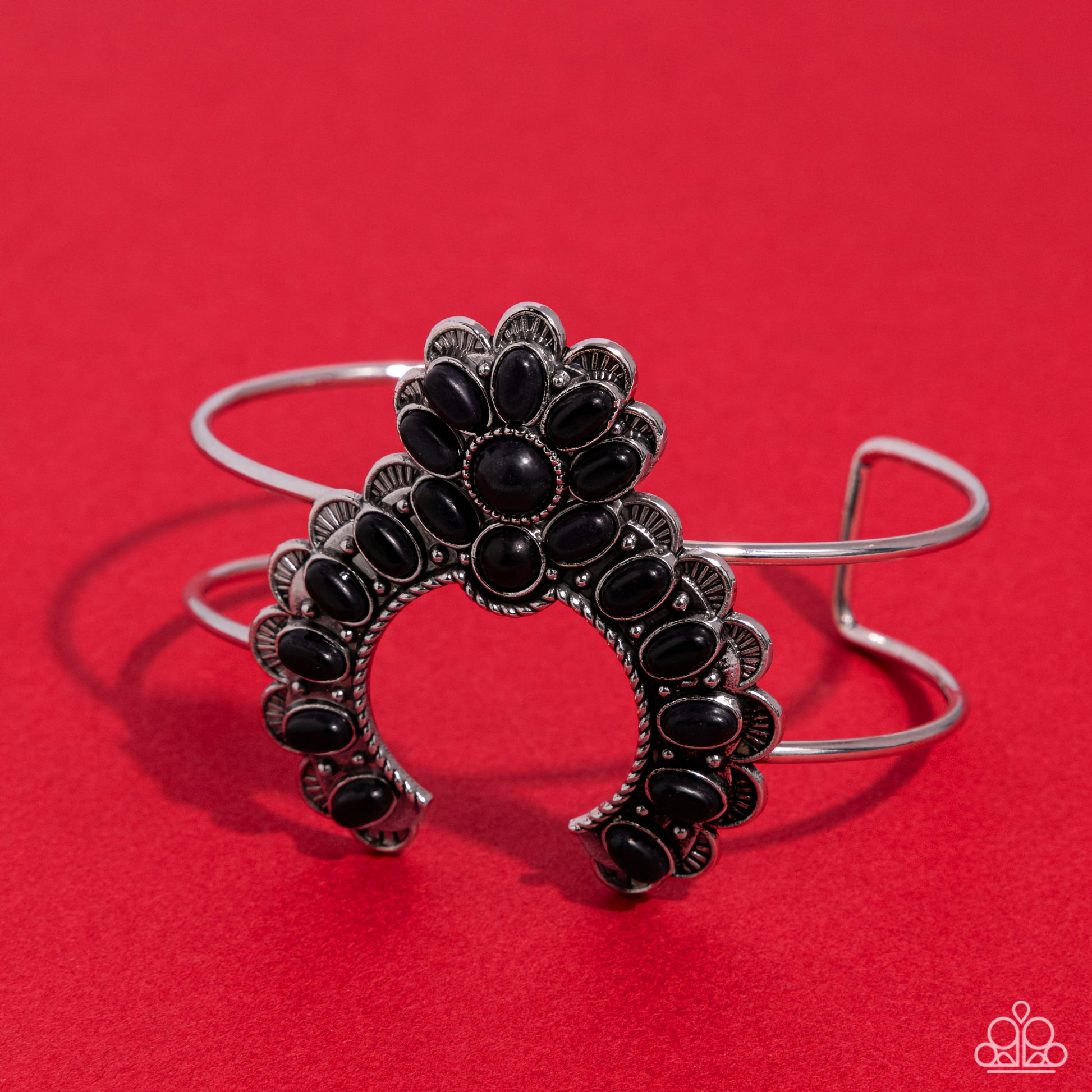Featured in the center of an airy silver cuff, an opulent, silver southwestern-inspired frame elongates up the wrist. Black stones, encased in the textured frame that features flared edges with airy scalloped cutouts, and a textured rope-like detail add an earthy pop of color to the design. As the stone elements in this piece are natural, some color variation is normal.